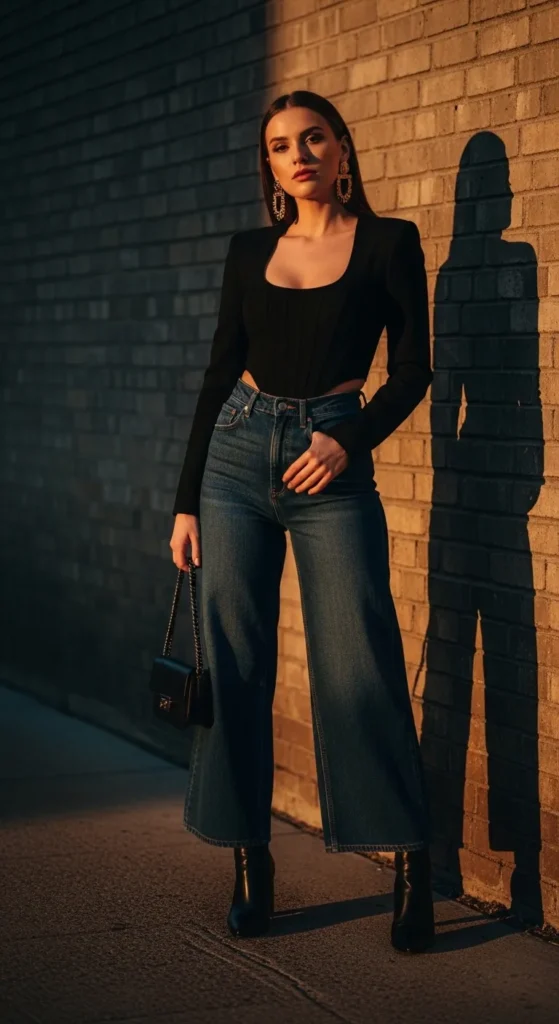 19. Corset Top + High Waist Wide Leg Jeans + Ankle Boots