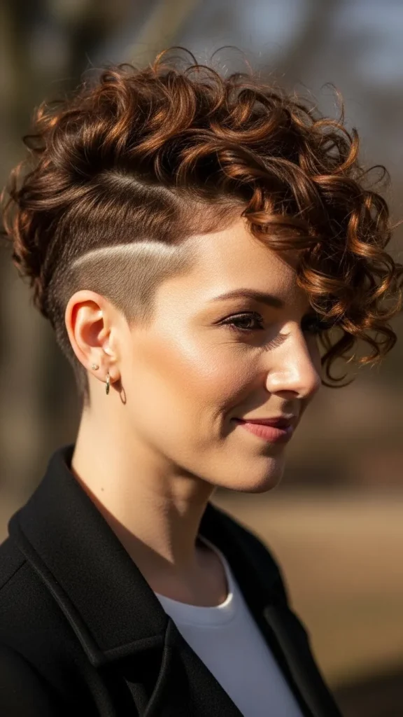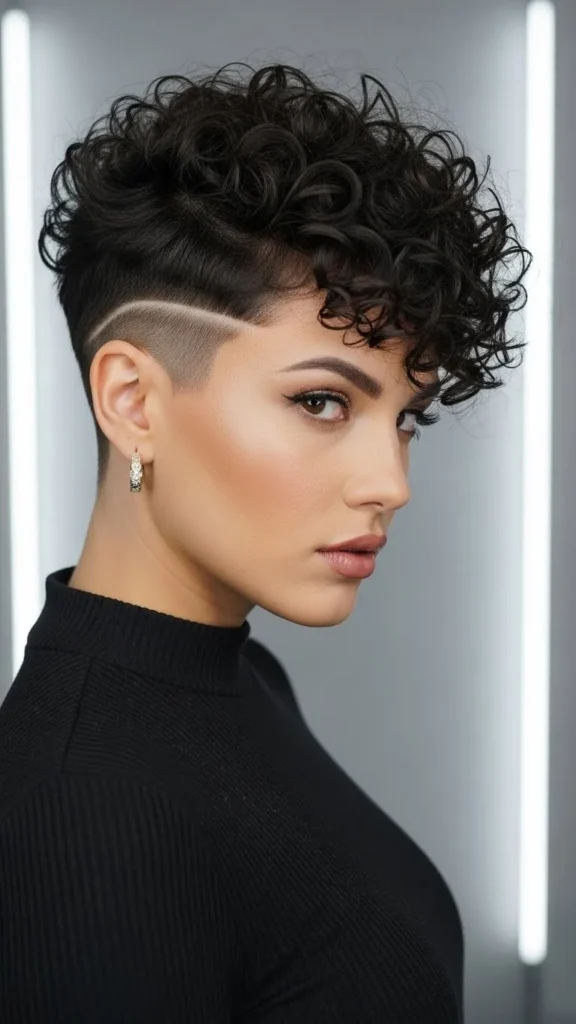 Curly hair gets a bold boost with a pixie undercut. The shaved sides highlight natural curls and create contrast.