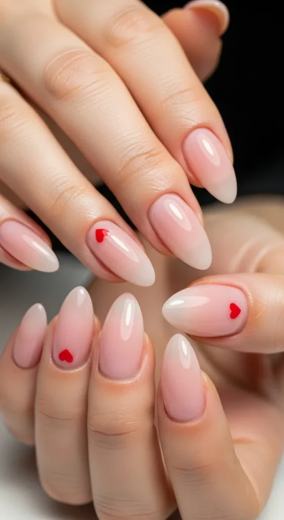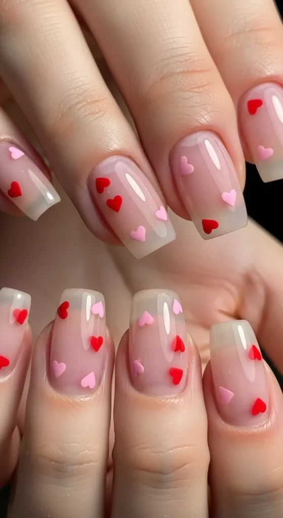 A pale pink base with tiny heart accents is a Valentine classic that never feels outdated.