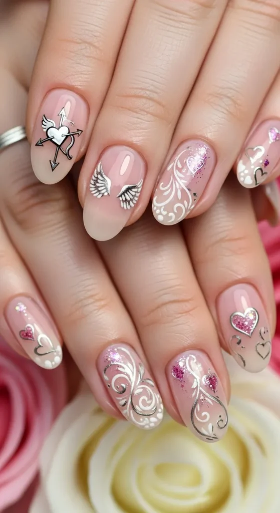 Soft nude or pink bases with arrows or wings give a whimsical Valentine look without feeling childish.