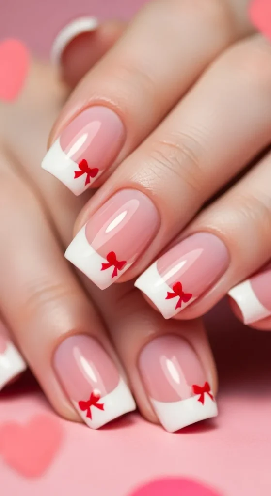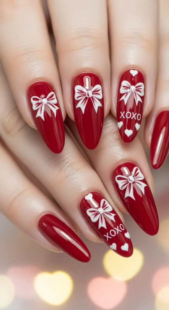 Red polish paired with white bow designs creates bold contrast while staying feminine.
