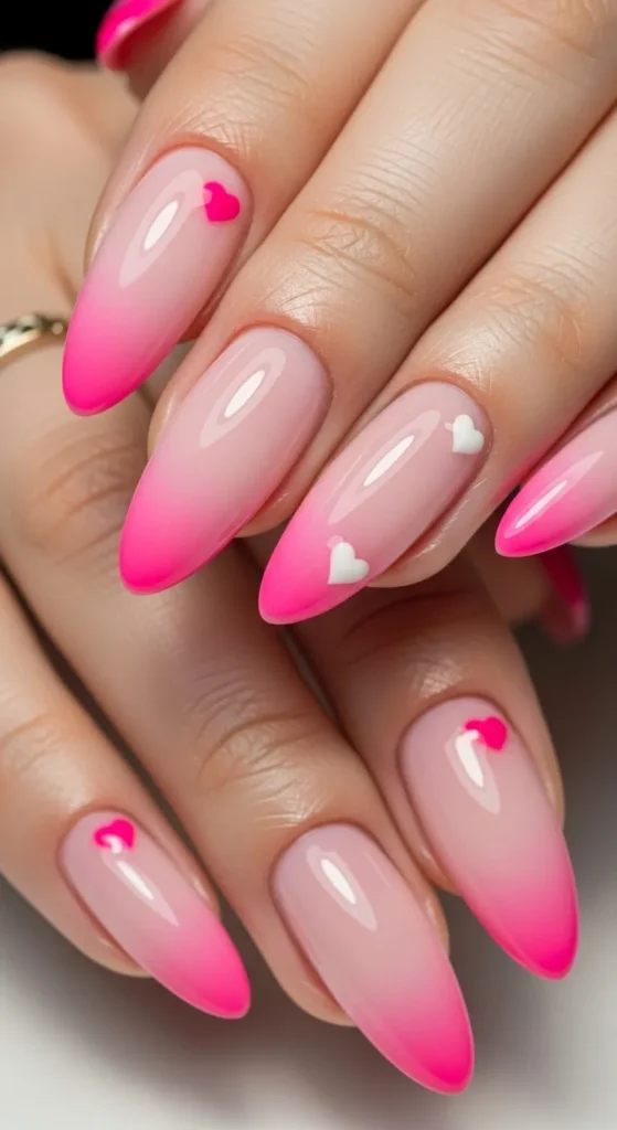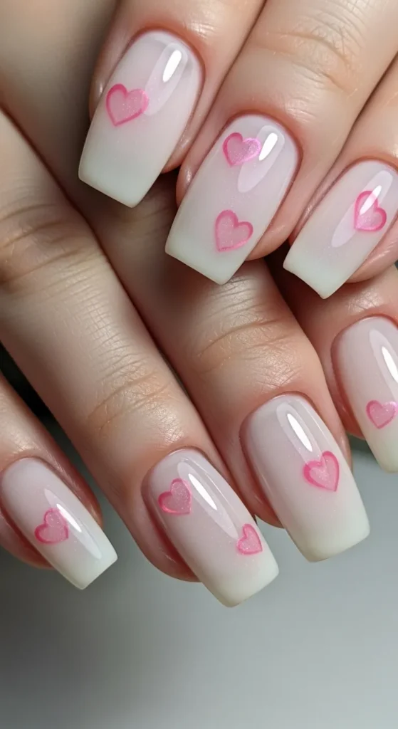 A pink ombré fade creates a soft, romantic base. Add tiny hearts or shimmer for depth. This design photographs beautifully and performs well on Pinterest.