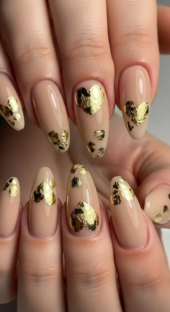Gold foil hearts elevate neutral nails into something luxe and Pinterest-worthy.