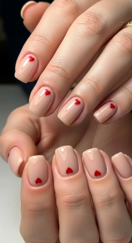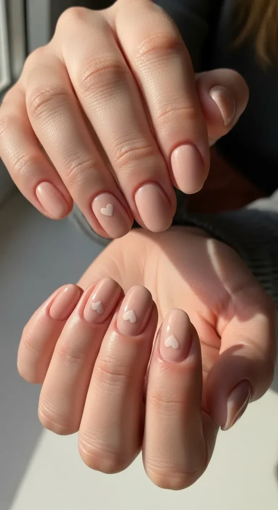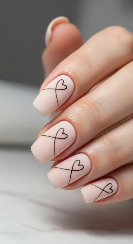 Soft pink or nude bases with minimal Valentine accents work all month long.
