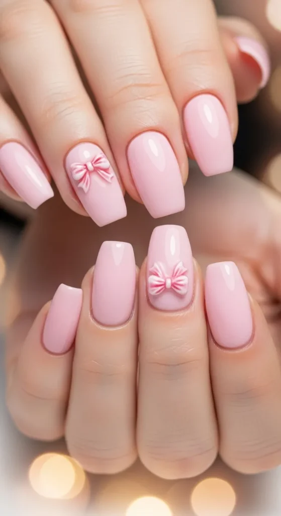Tiny bow details instantly make nails feel girly and playful. This look pairs best with pastel pink shades and glossy finishes.