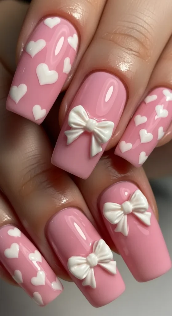 Mix hearts and bows across different nails for a playful but cohesive design. Ideal for Pinterest users who love variety.