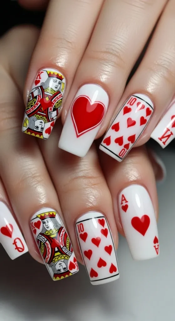 Playing-card-inspired nails with heart symbols feel creative and fun—perfect for those wanting something different.