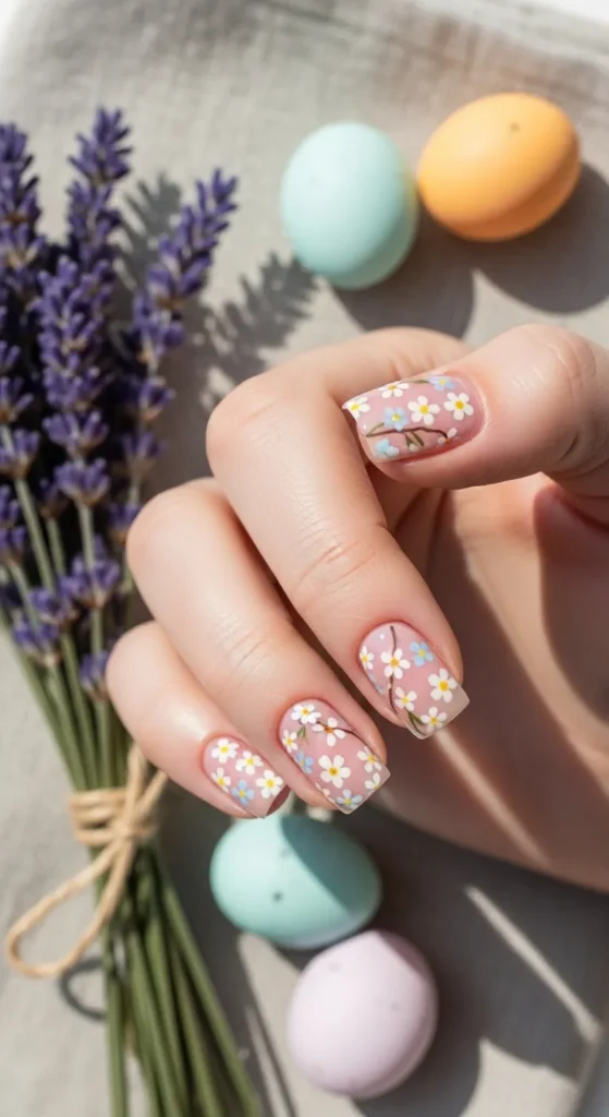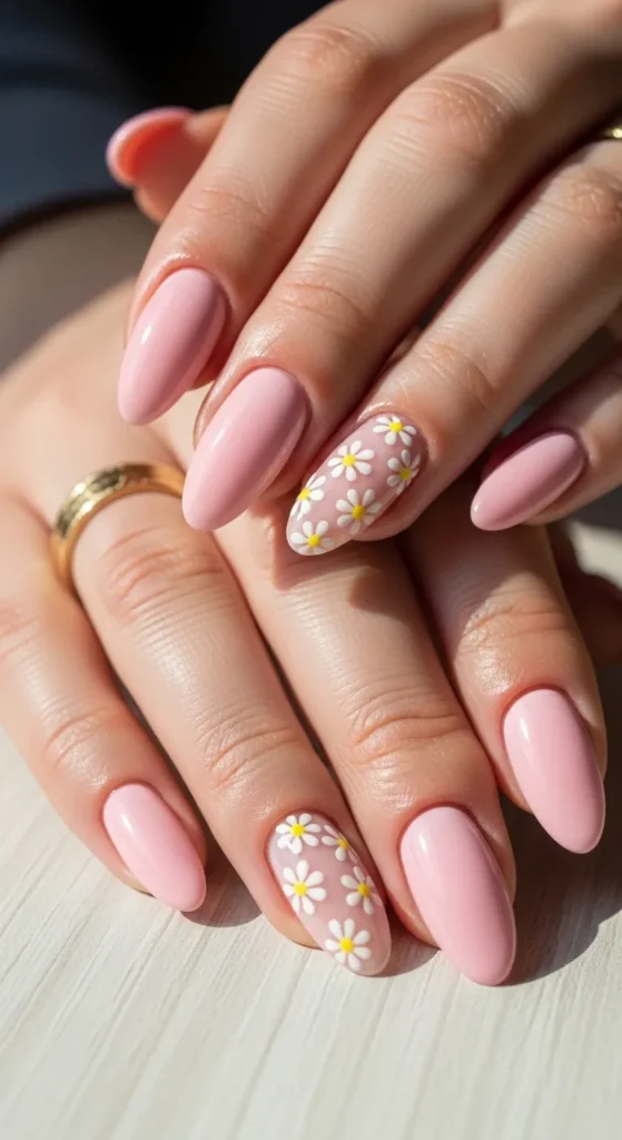 Pink nails with small daisy accents feel cheerful and youthful. The daisies can be placed on one or two accent nails for a balanced look.