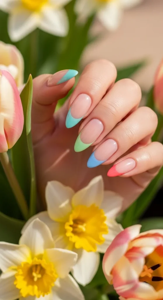 A playful twist on classic French tips, this style uses different pastel colors for each tip. Shades like mint, lavender, baby blue, and coral instantly give vacation energy.