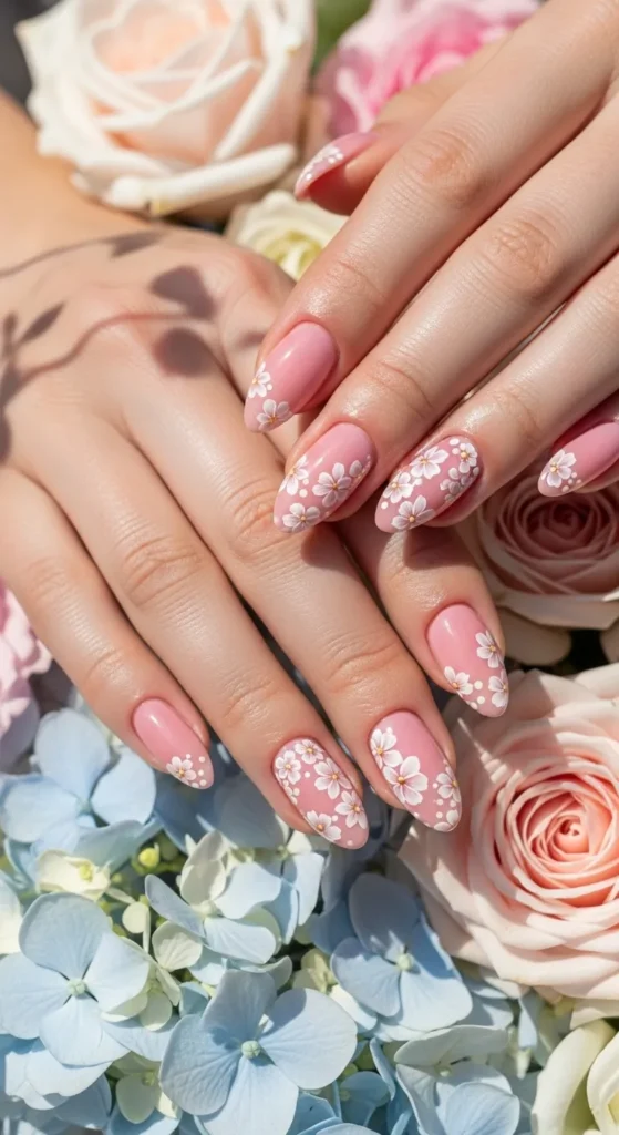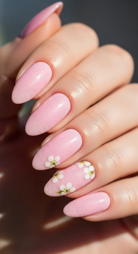 Baby pink nails with tiny floral accents are perfect for a soft spring aesthetic.