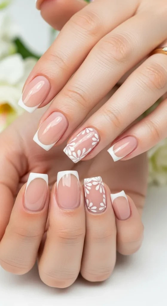Square nails with floral French tips create a modern and polished look. Instead of plain white tips, the edges feature tiny flowers for a creative twist. It’s stylish yet still elegant.