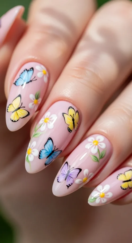 Butterflies paired with tiny floral designs create a whimsical spring manicure. A soft pink background keeps the design feminine and light. This nail style is especially popular on Pinterest for its dreamy aesthetic.
