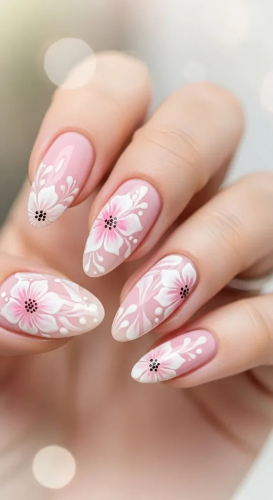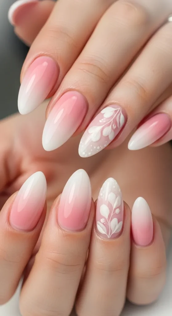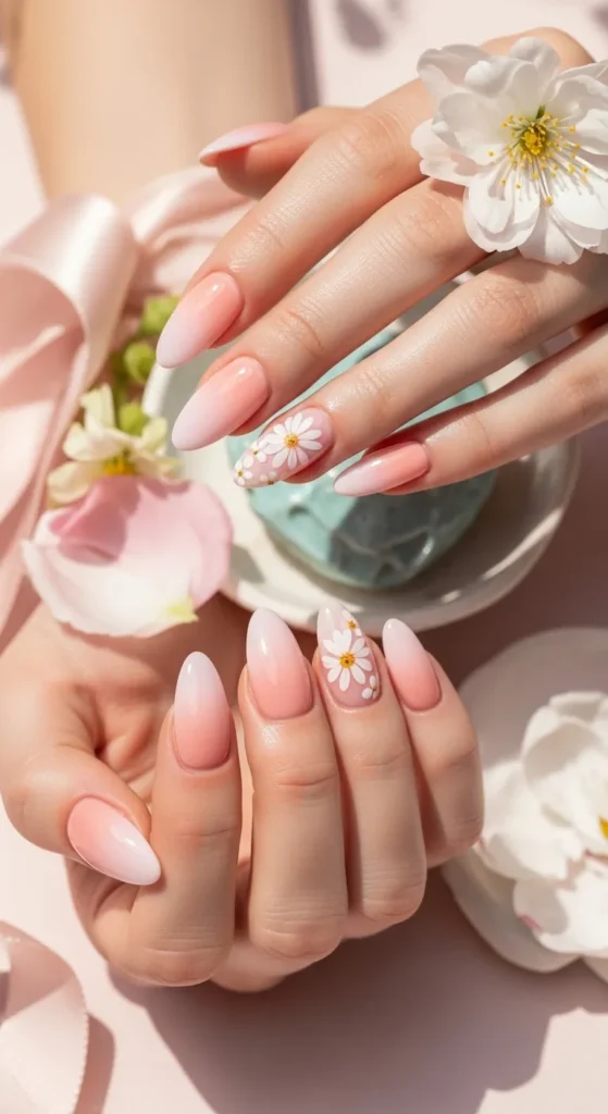 A pink ombre base fading from blush to baby pink creates a dreamy nail design. Adding delicate flowers on top makes the manicure feel even more romantic. This style looks especially beautiful on longer almond nails