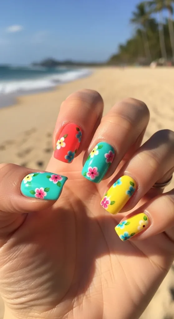 Bright tropical shades like coral, turquoise, and sunshine yellow make these nails perfect for a beach trip.