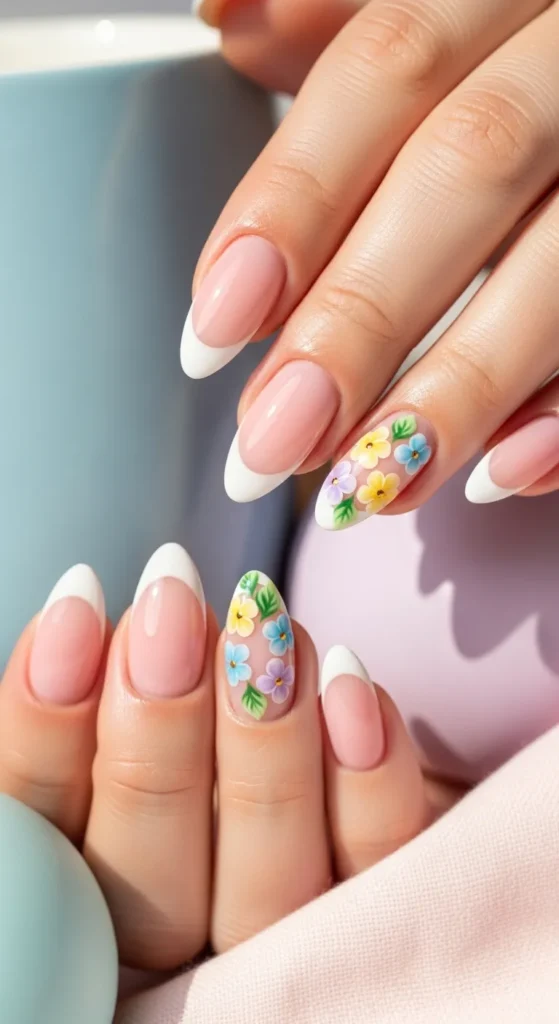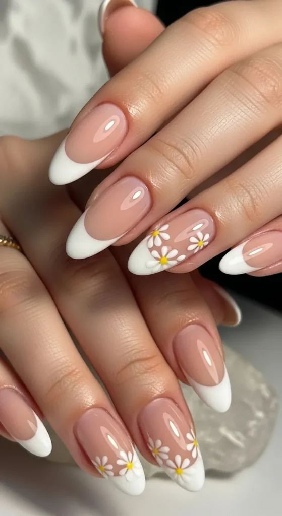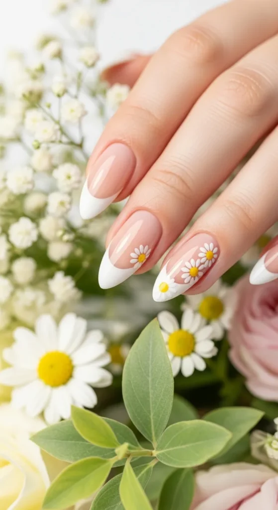 Almond nails with daisy French tips feel modern and fresh. Instead of a traditional white tip, the edge of the nail features tiny daisy petals. This creative design is trending heavily on Pinterest.