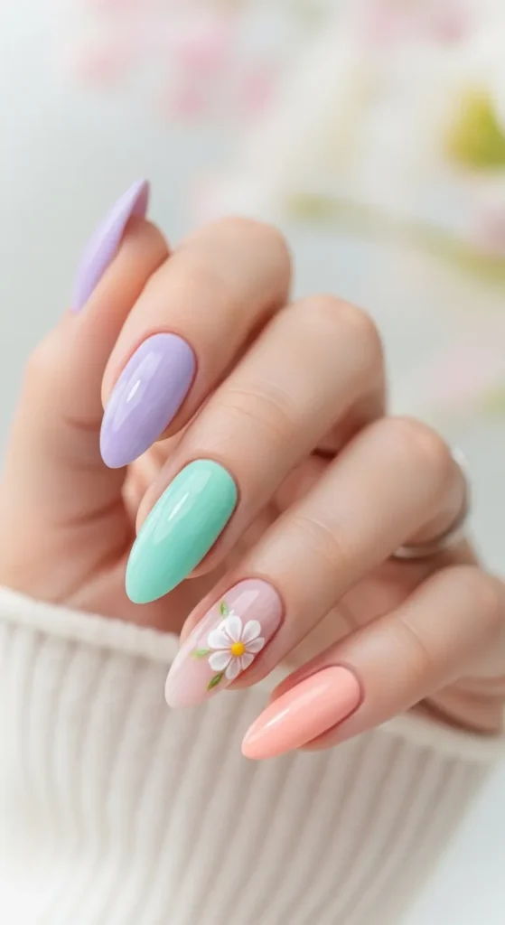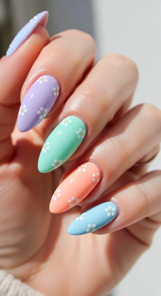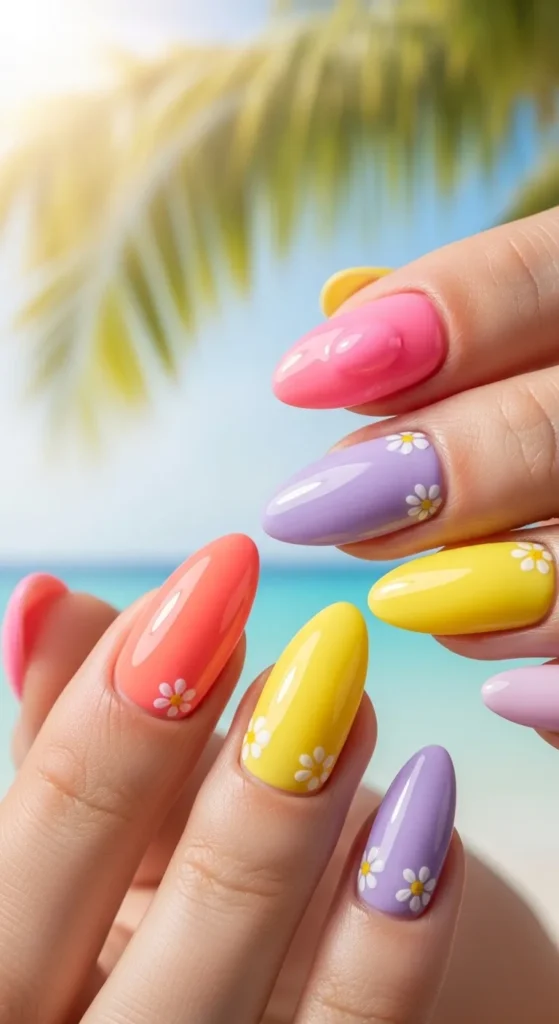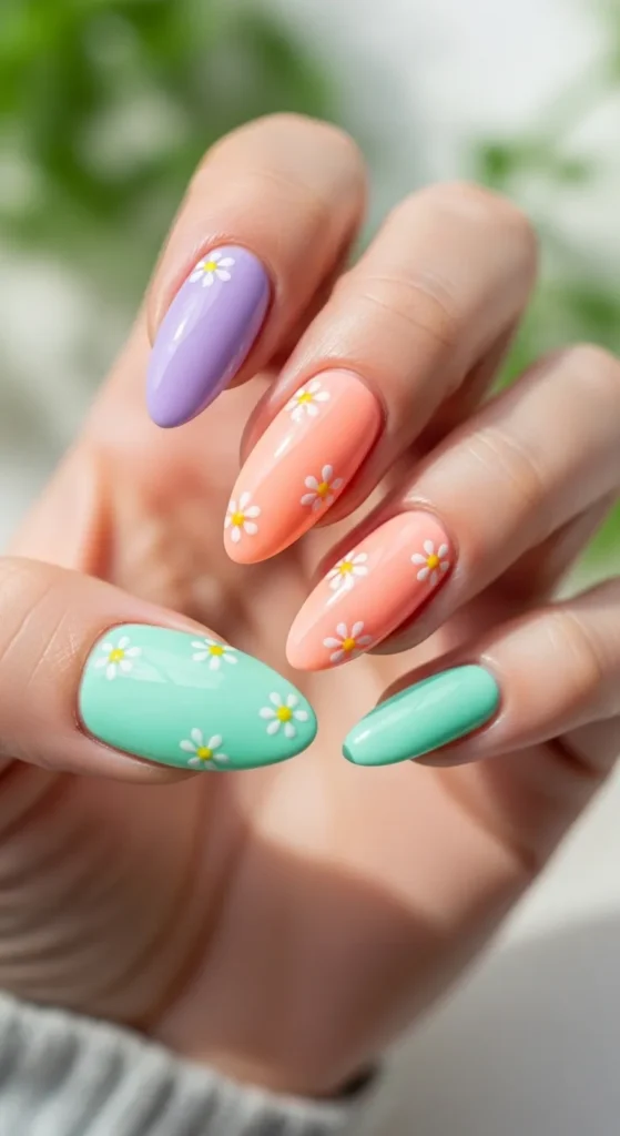 Mixing bright nail colors with white daisy art creates a cheerful manicure. Shades like lavender, peach, and mint work beautifully together.