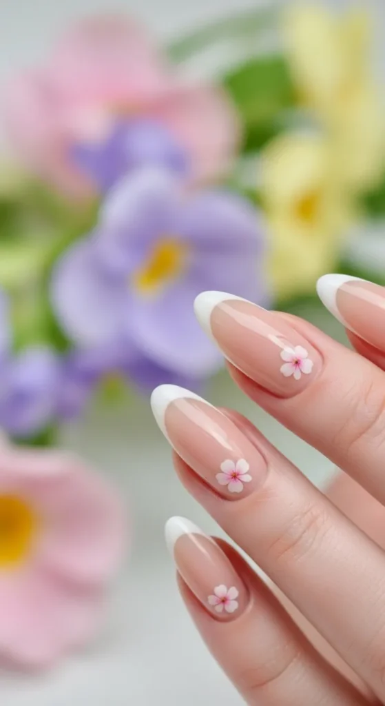 A nude base with classic white French tips gets a spring upgrade with tiny flower details.