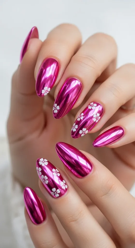 Adding floral accents softens the bold finish and keeps the manicure spring-inspired. It’s perfect for those who love trendy nail designs.