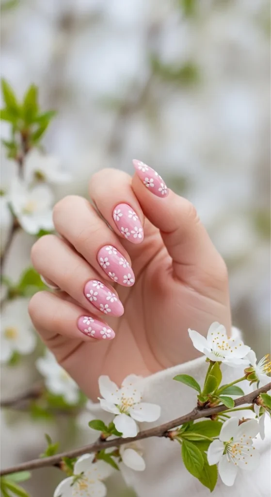 Soft pastel pink nails with tiny white flowers create a delicate and feminine manicure. This design is perfect for beach vacations or brunch dates during spring break.