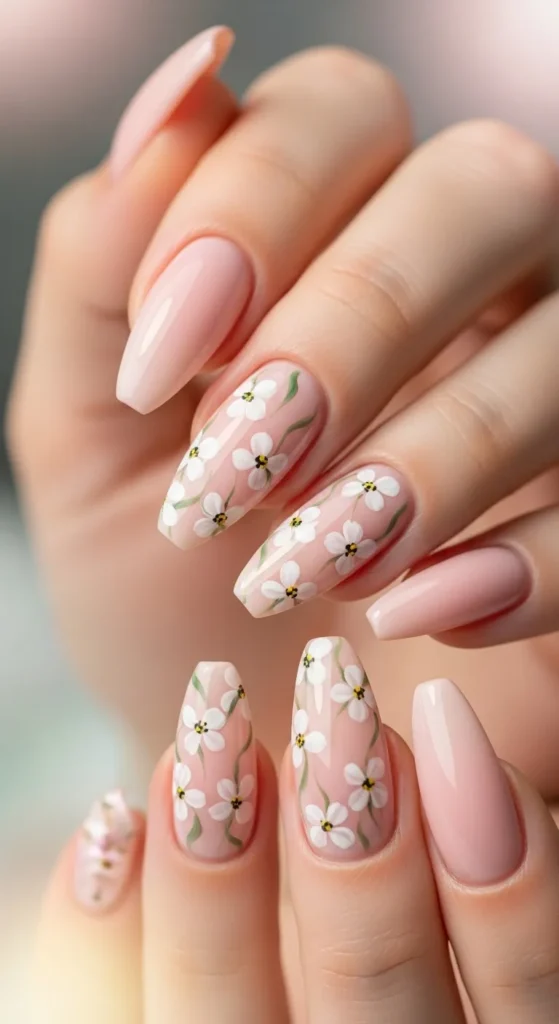 A soft pink base paired with hand-painted flowers creates a romantic spring manicure. This design works beautifully for those who love long, elegant nails.