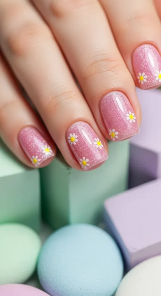 Pink glitter nails with white daisies create a fun and sparkly manicure. The combination feels playful and perfect for vacation photos. This design works beautifully for spring festivals or beach trips.