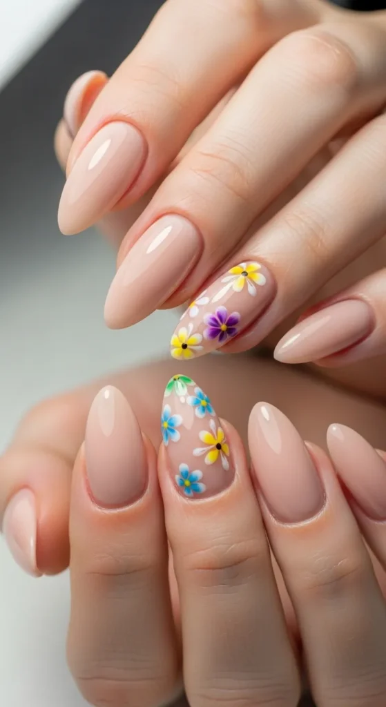 A neutral base with colorful floral accents keeps the manicure balanced and stylish.