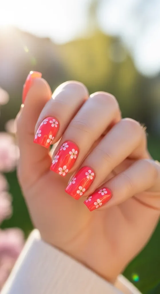 Coral nails instantly feel warm and sunny. When paired with small white or pink flowers, the manicure becomes playful and vibrant.