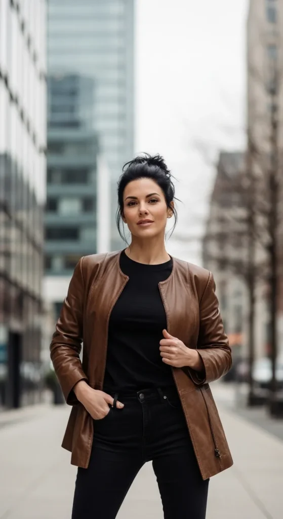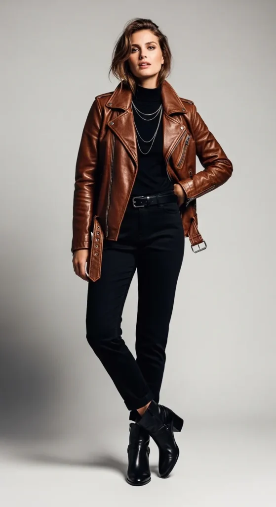 An all-black base makes your jacket the star. Pair black jeans, a black top, and black boots, then layer the brown jacket on top for contrast. It’s simple, chic, and perfect for minimalists.