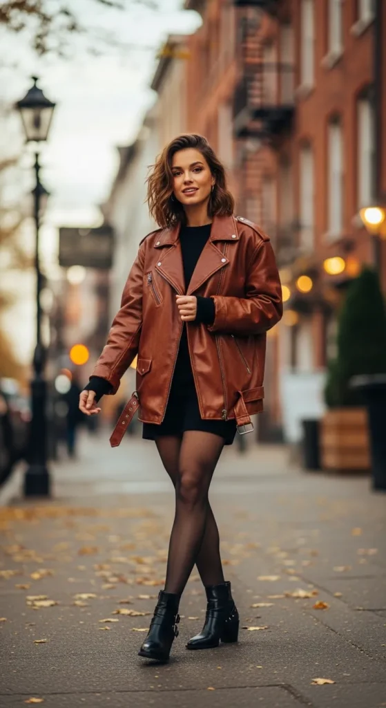This outfit feels playful yet fall-appropriate. Pair a mini skirt with opaque tights, ankle boots, and your brown leather jacket. Great for date nights or city outings.
