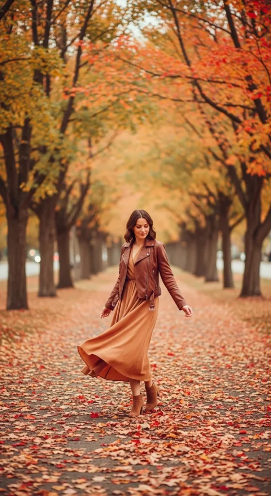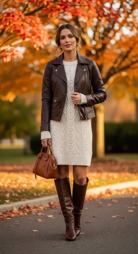 A sweater dress paired with a brown leather jacket feels cozy and feminine. Add knee-high boots for extra fall appeal.