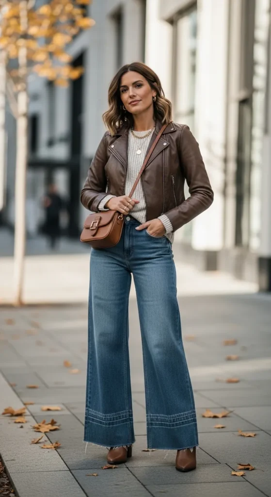 11. Brown Leather Jacket + Wide-Leg Jeans