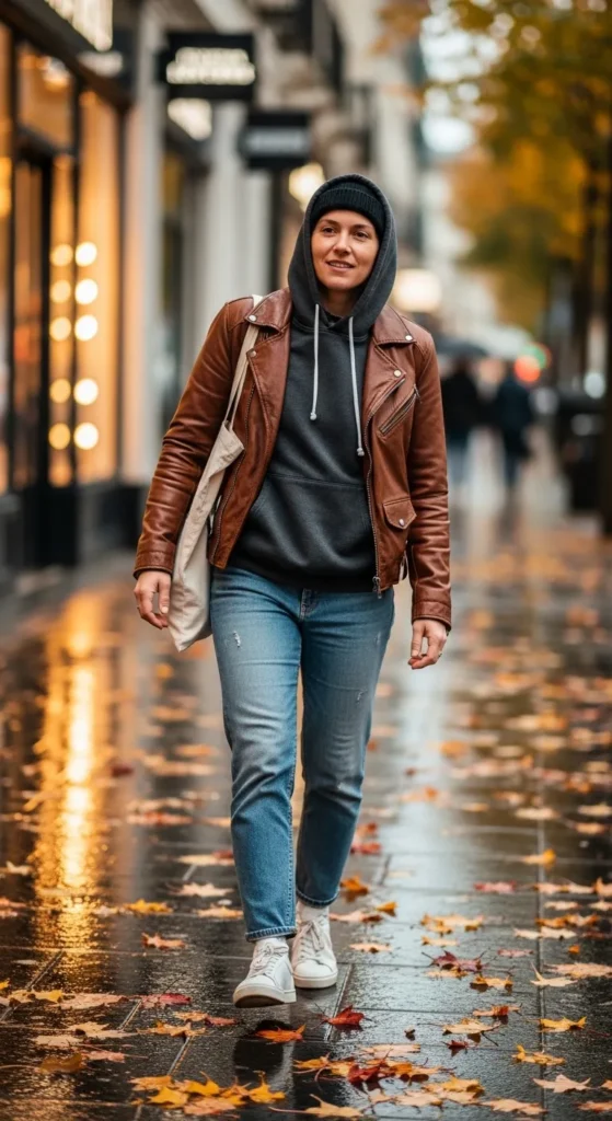 Layering a hoodie under a leather jacket gives a sporty, casual edge. Stick to neutral hoodies to keep the look intentional rather than messy.