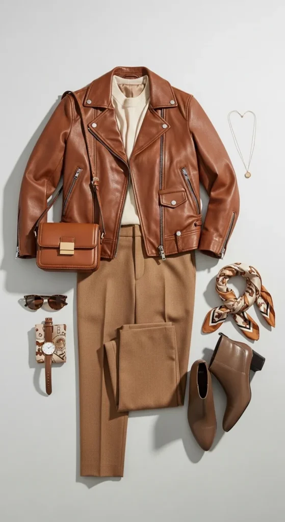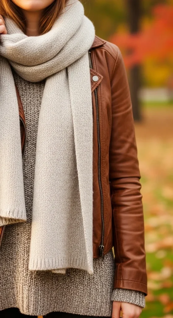 20. Brown Leather Jacket + Neutral Scarf