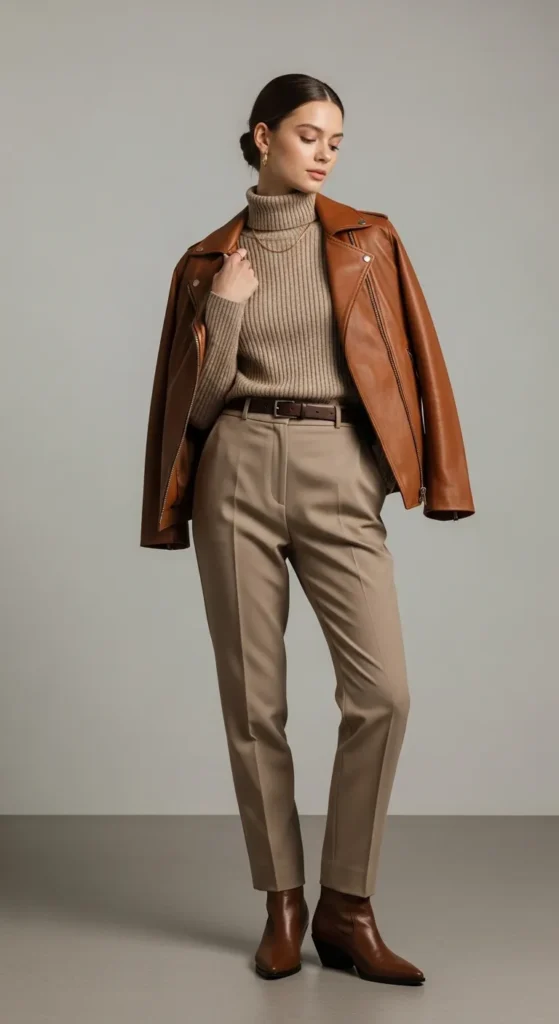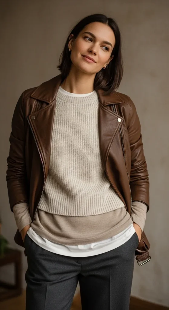 23. Brown Leather Jacket + Layered Neutrals