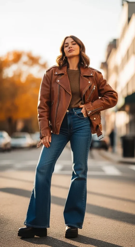 19. Brown Leather Jacket + Flared Jeans
