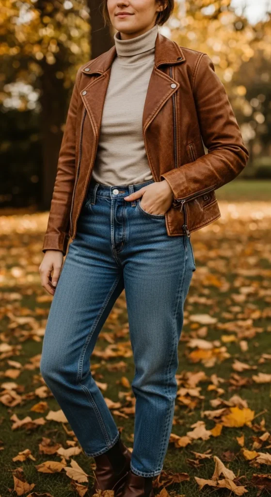 7. Brown Leather Jacket + Turtleneck + Jeans
