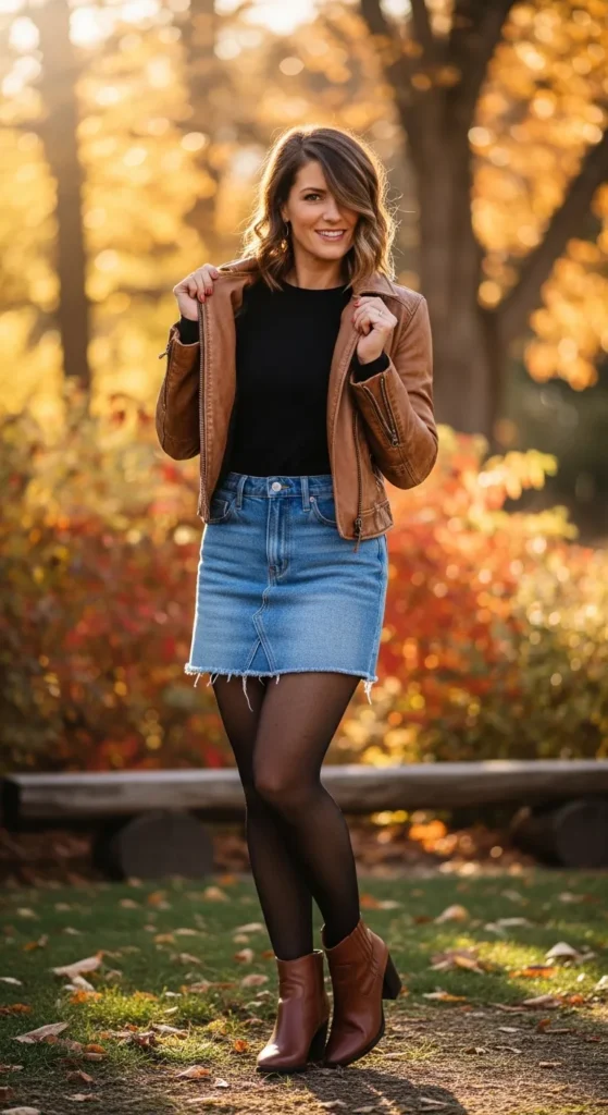 A denim skirt with tights and boots creates a fun fall outfit. The leather jacket adds structure and warmth.