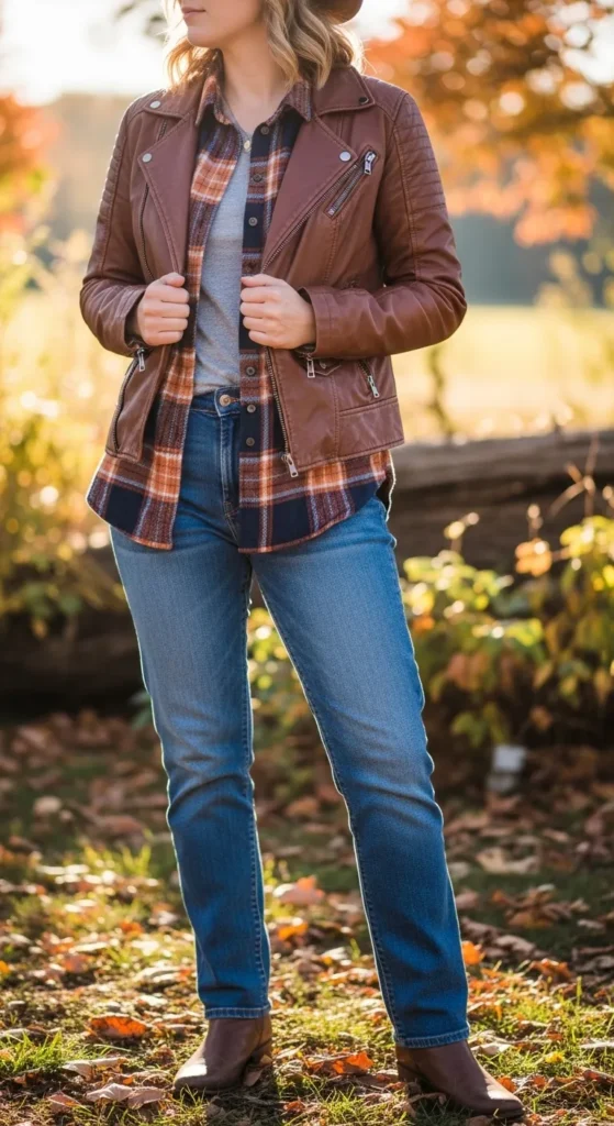 4. Brown Leather Jacket + Plaid Shirt + Denim