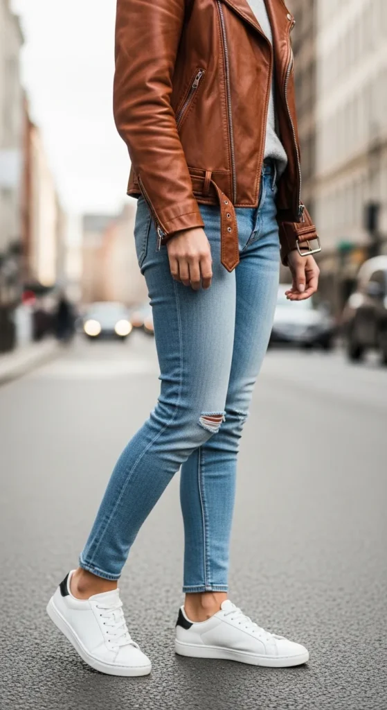 21. Brown Leather Jacket + White Sneakers