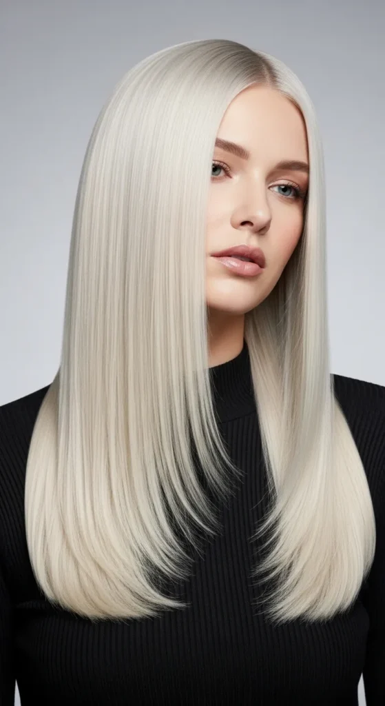Platinum blonde paired with blunt ends gives hair a strong, full silhouette. The clean edge at the bottom instantly makes strands look thicker. Keep layers minimal and focus on shine for a sleek, high-end finish.