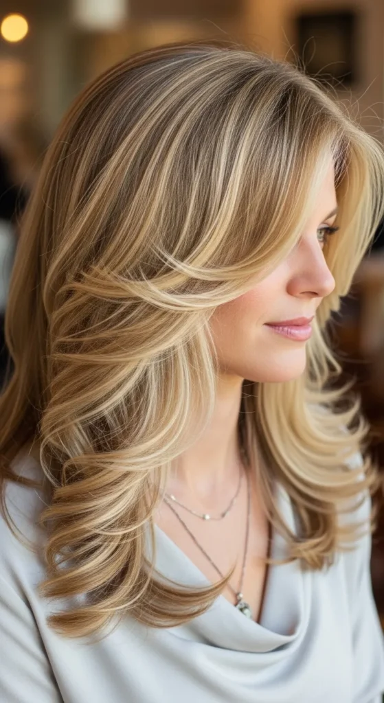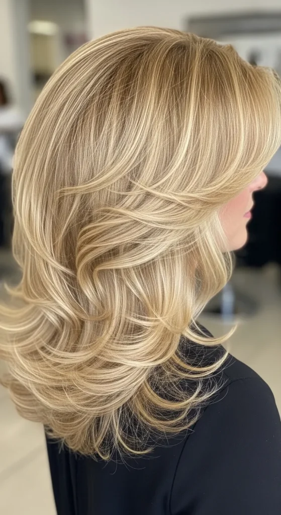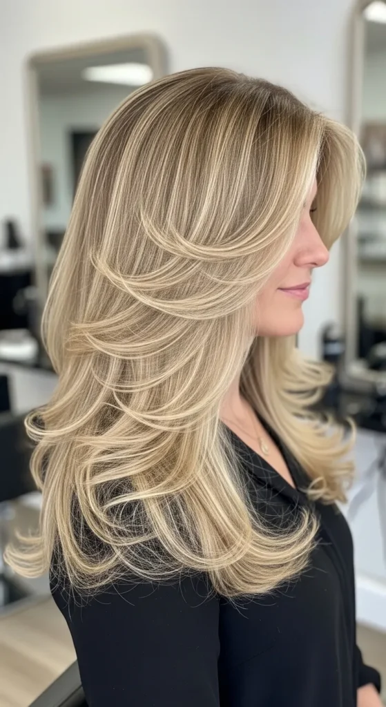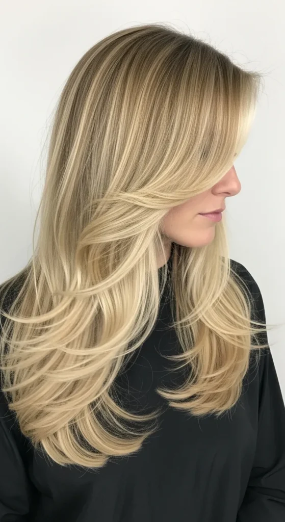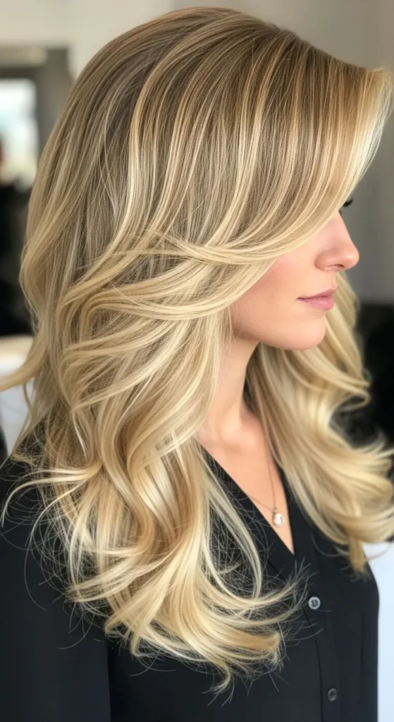 Invisible layers add movement without thinning the ends. They’re ideal if you want fullness but fear losing length. Paired with blonde tones, the result is soft, thick-looking hair that moves naturally.