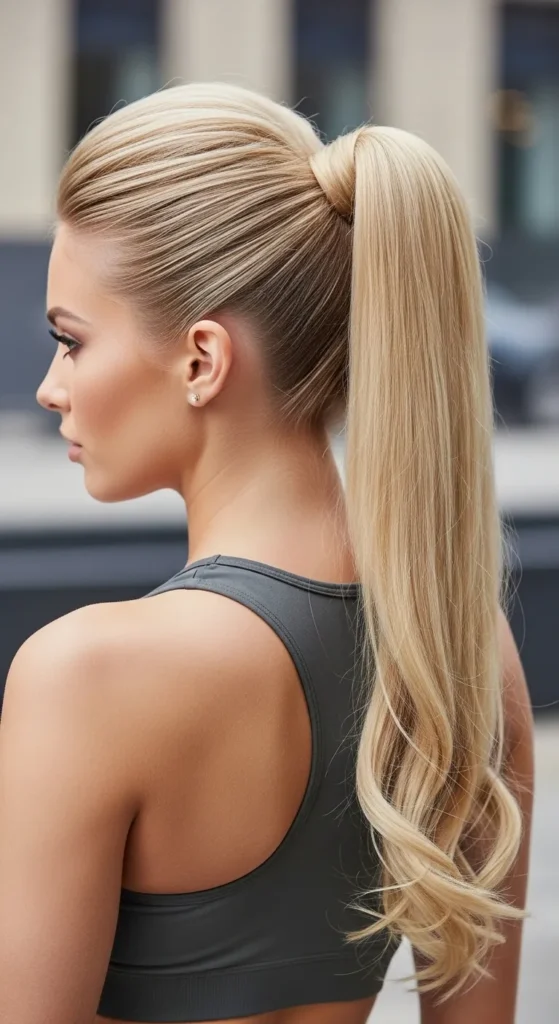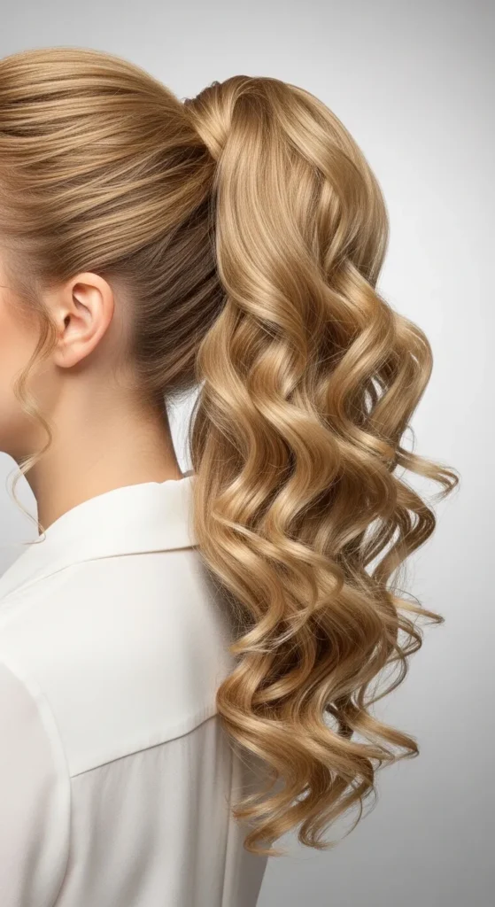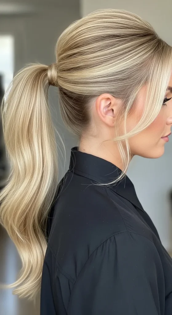 A ponytail doesn’t have to be flat. By teasing the crown slightly and wrapping a strand around the base, you get a thick, elevated look. This works especially well for long blonde hair because light tones highlight volume.
