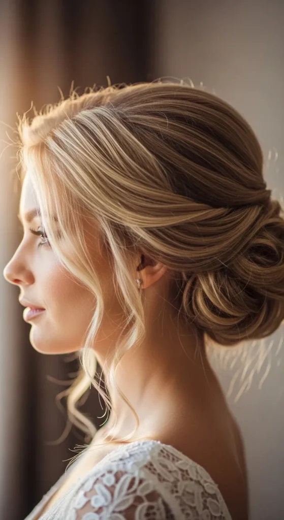 Messy, textured updos are volume gold. Leaving soft pieces around the face and crown creates the illusion of dense hair—even if it’s fine. Blonde tones enhance the texture, making every twist visible.