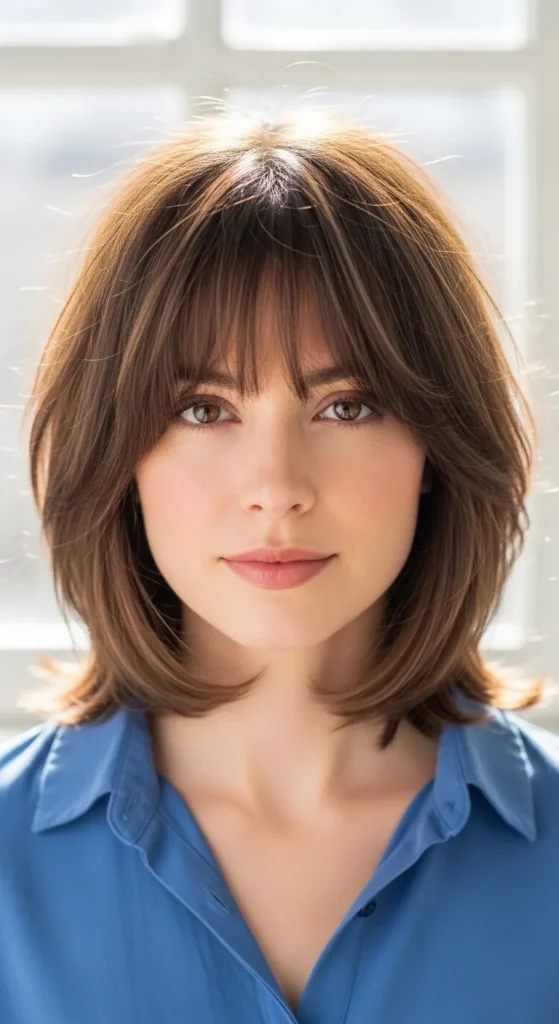 Window bangs instantly soften a layered bob, framing the face beautifully. This style works especially well if you want to balance a round or fuller face. The layers blend seamlessly into the bangs, creating a light, airy look that photographs beautifully for Pinterest.