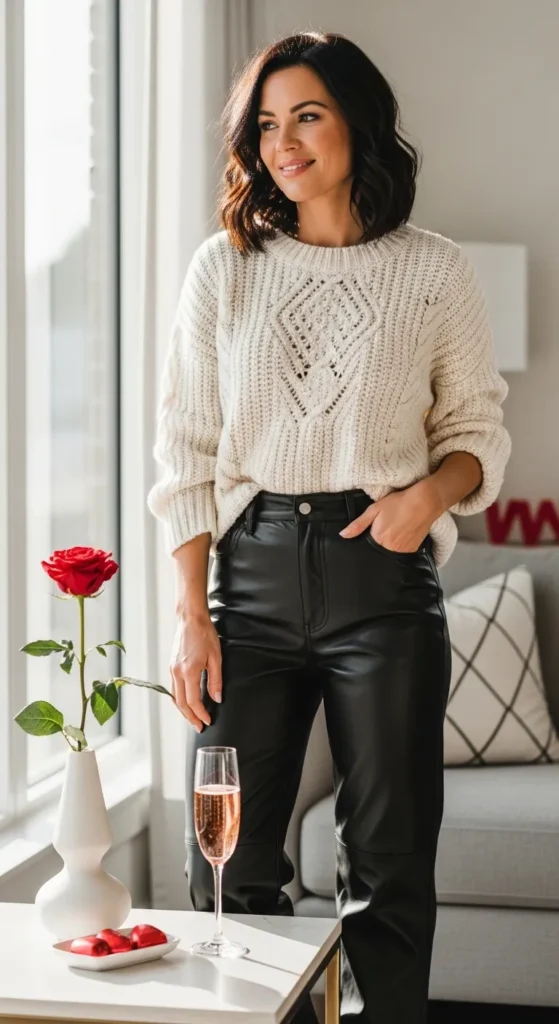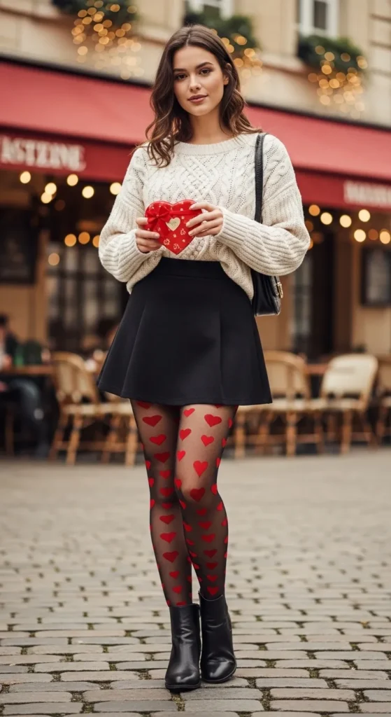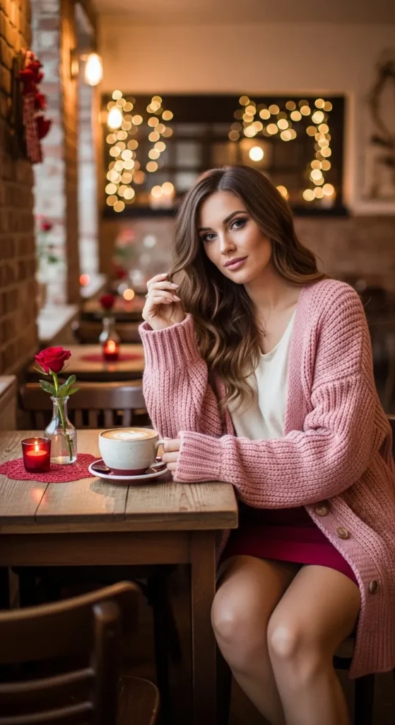 This look balances cozy and flirty perfectly. A button-up or cropped cardigan paired with a mini skirt feels youthful, feminine, and very Pinterest-approved—especially in Valentine shades like cream, blush, or cherry red.