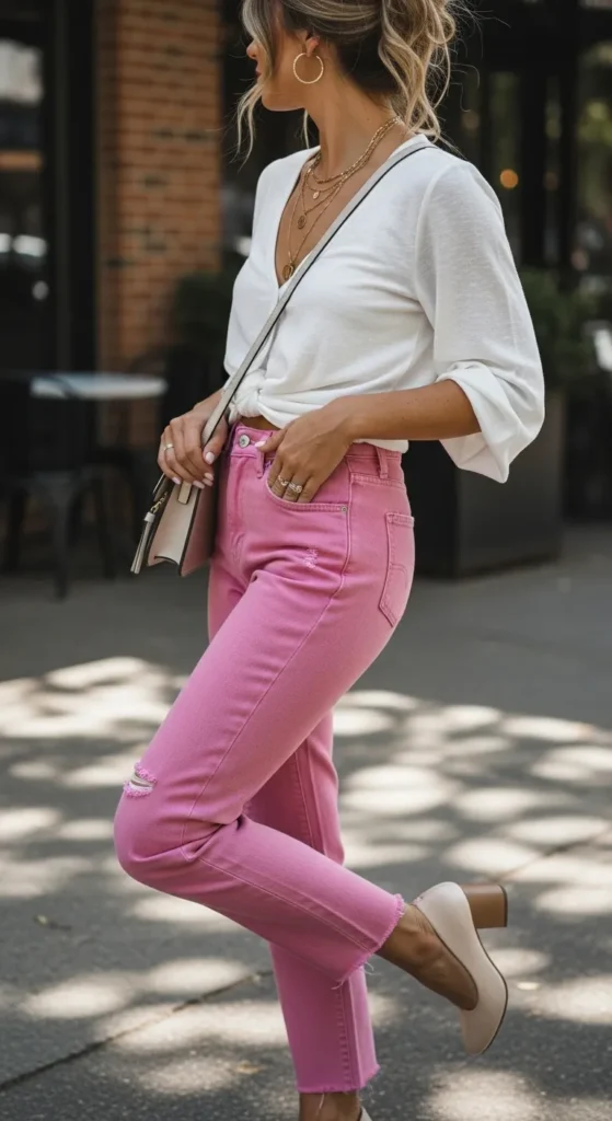 Pink denim is trendy and easy to style for Galentine’s Day.