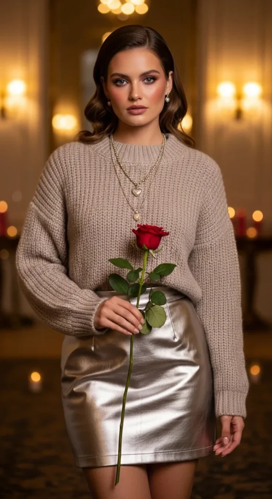 A satin slip dress feels romantic, while a chunky sweater makes it Galentine-appropriate. This outfit works beautifully for brunch or dinner when you want to feel dressed up but not overdone.