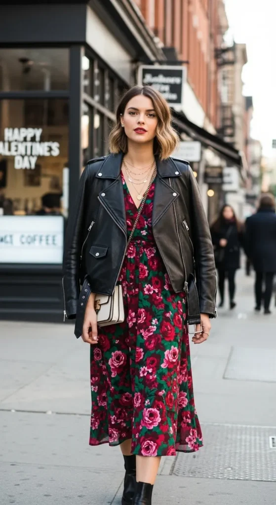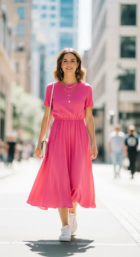 This look is perfect for women who want comfort without sacrificing style. Sneakers keep it casual, while the midi dress gives Valentine charm.