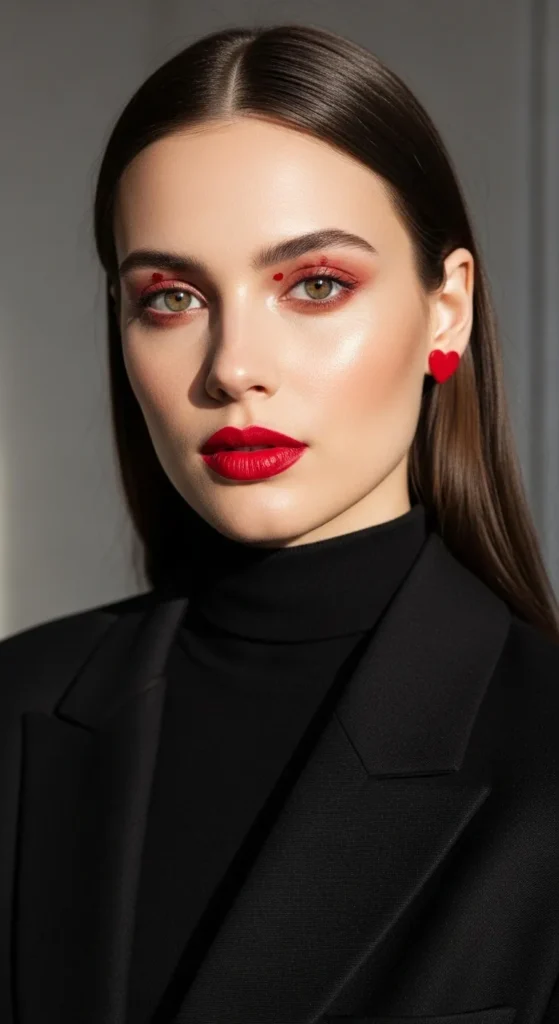 When in doubt, let makeup do the work. A bold lip or heart blush adds Valentine energy instantly.