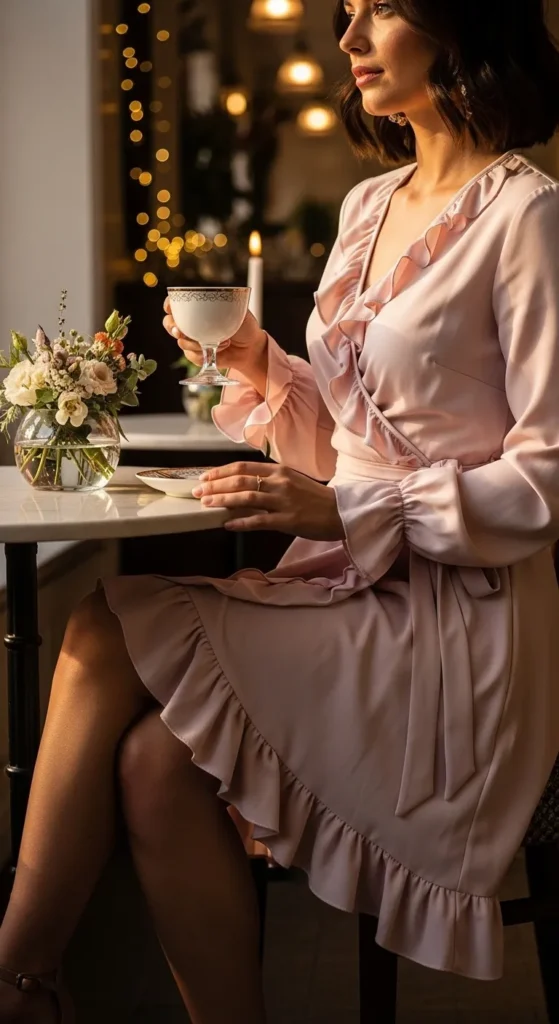 Wrap dresses are flattering, comfortable, and easy to style. Soft prints, ruffles, or subtle textures make this a Galentine-ready option that feels effortless.